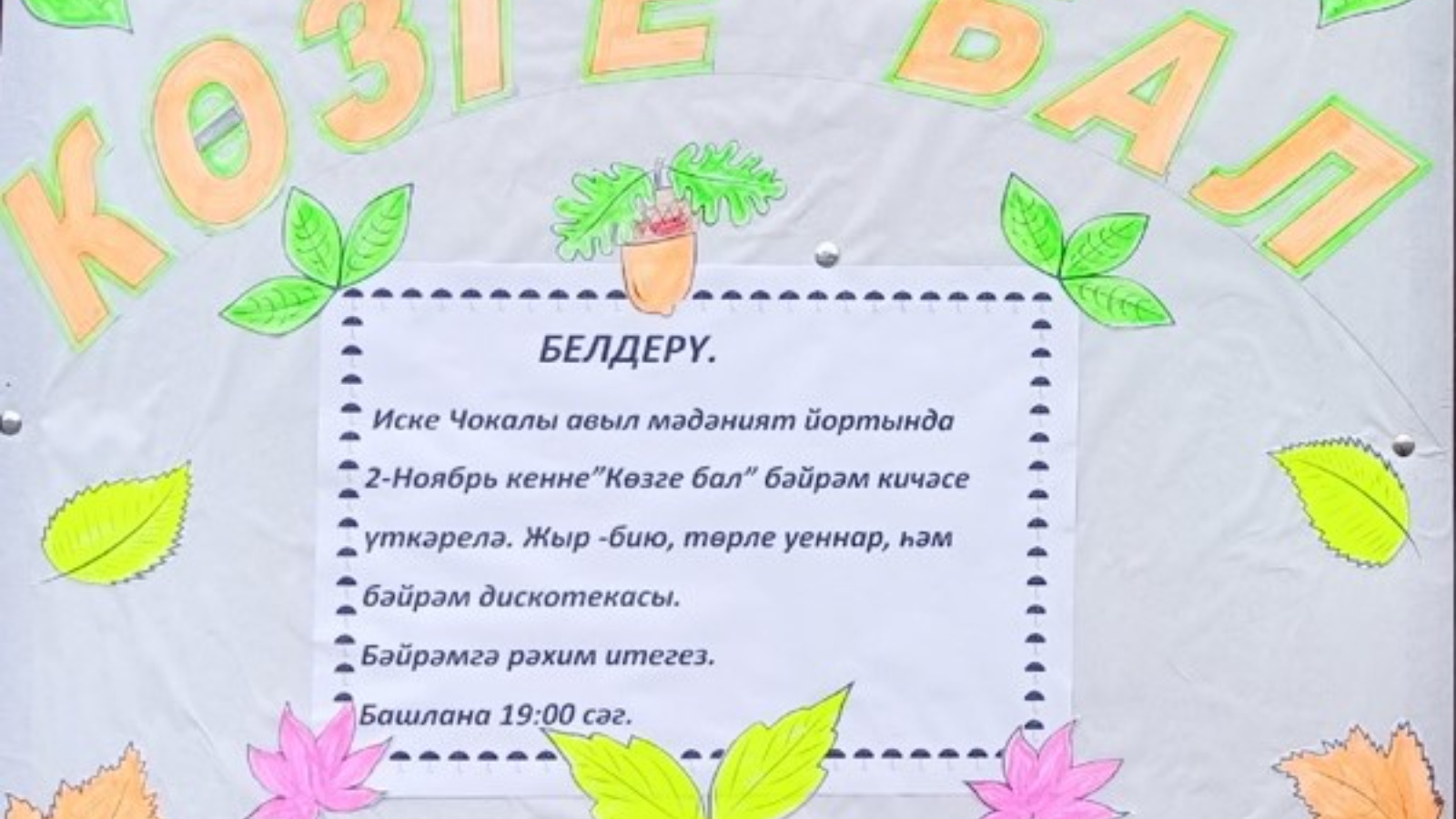 2 ноябрьдә Иске Чокалы мәдәният йортында "Көзге бал" үткәрелә. Рәхим итегез.