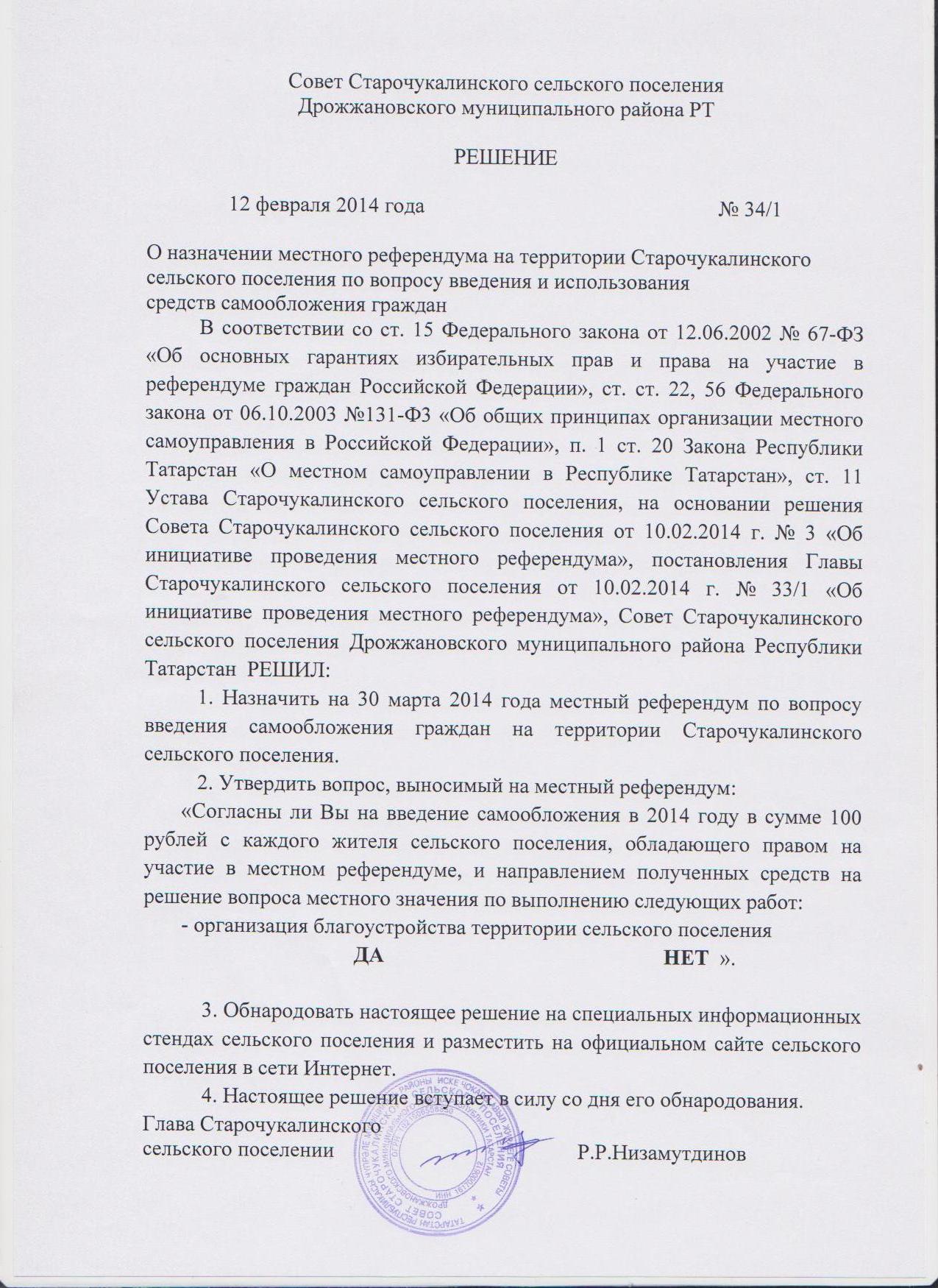 О назначении местного референдума на территории Старочукалинского СП по вопросу введения и использования средств самооблажения граждан